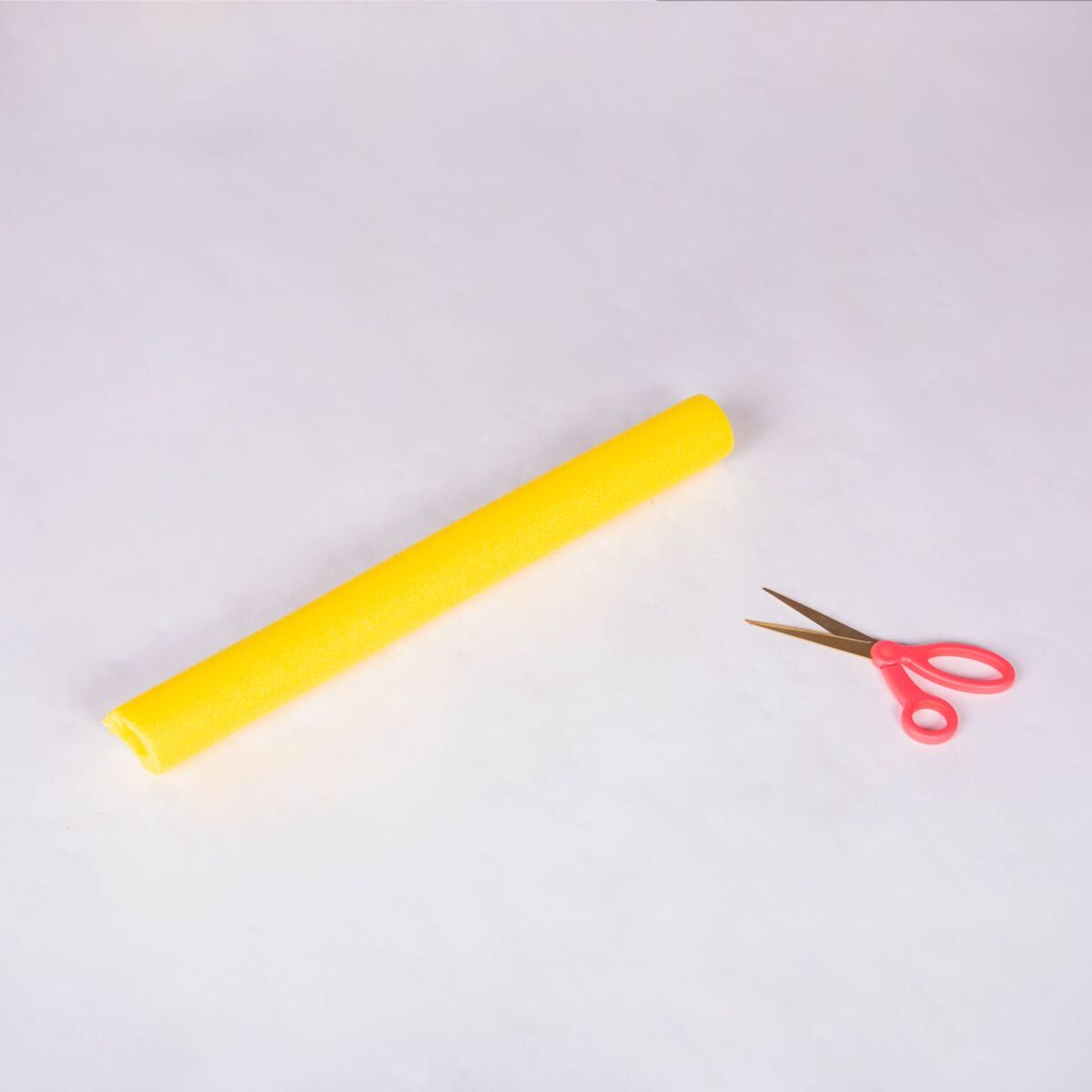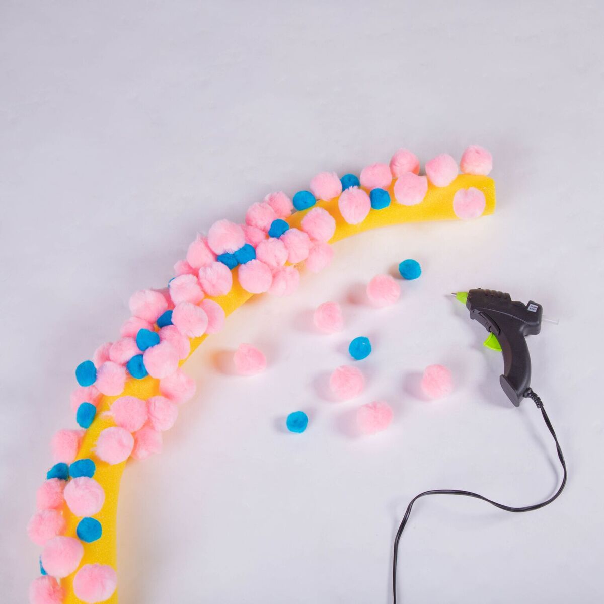 Insert the pool noodle into the bucket to create the full to the brim illusion of Dippin' Dots. Connect the suspenders to the outside of the bucket, and put on the headband. Taadaa! All done!