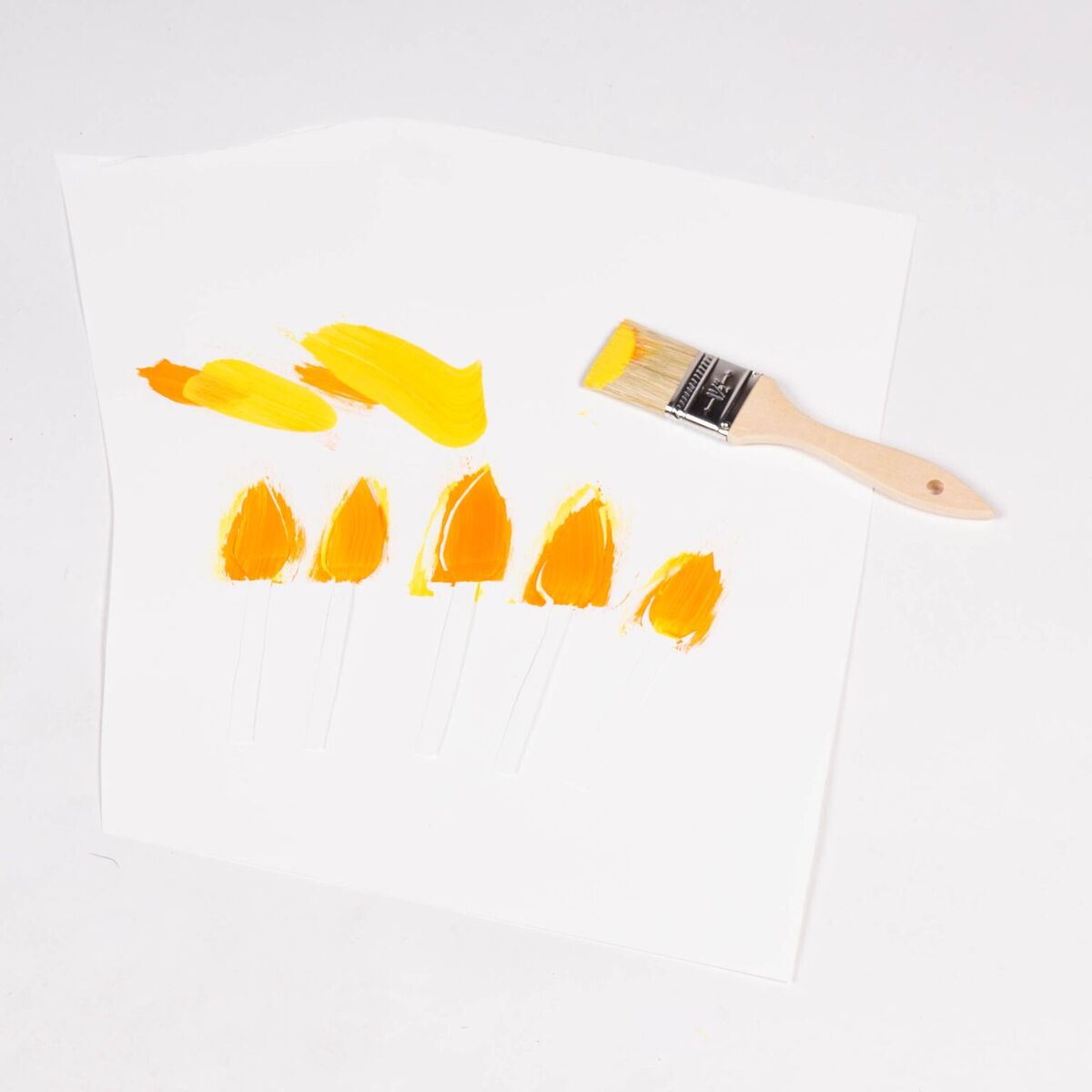 Make your candle headband. To do this: 1. sketch out candle shape onto construction paper. 2. Cut out the candles and paint the top portion orange. 3. Then, cut out smaller yellow drops from the construction paper. 4. Glue small yellow drops onto the center of the flame. 5. Glue your candles to your headband.