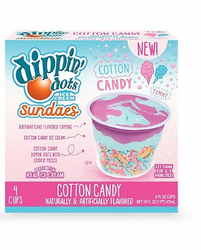 Cotton Candy Dippin' Dots are mixed with yummy cookie pieces, and topped with Cotton Candy ice cream and Birthday Cake sauce!