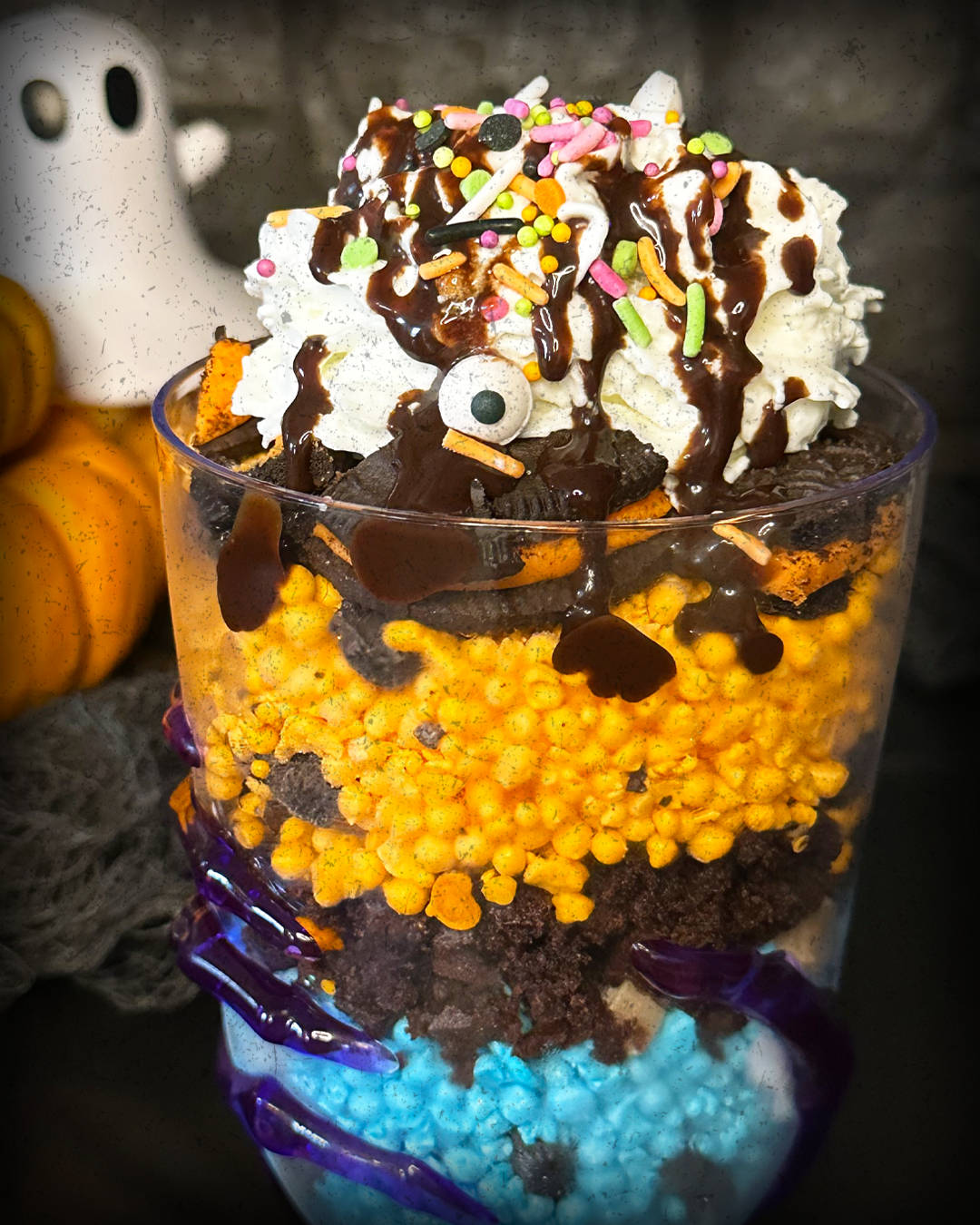 See RecipeTrifle of Terror stacks Cookie Monster Dippin’ Dots, brownies, and chocolate syrup into a monstrously sweet Halloween treat.